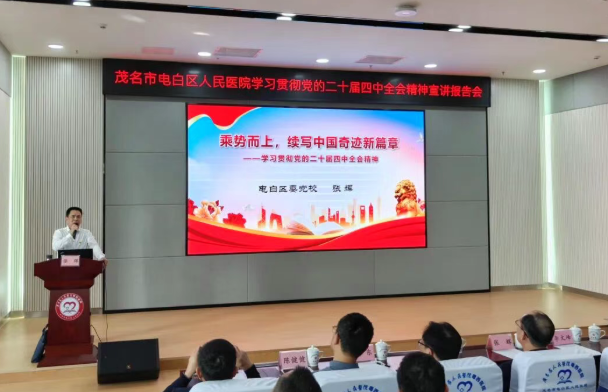 为深入学习领会、全面准确把握党的二十届四中全会的重大意义、精神实质和核心要义,引导全院党员干部职工切实把思想和行动统一到全会精神上来,把智慧和力量凝聚到落实全会提出的各项任务上来,奋力推动医院各项事业高质量发展。12月30日下午,广东省人民医院粤西医院(茂名市电白区人民医院)召开学习贯彻党的二十届四中全会精神宣讲报告会。会议由医院党委书记冼明健主持,邀请了区委党校常务副校长张辉同志作专题宣讲辅导,医院党、政领导班子成员,纪委委员,各党支部委员,各职能、临床、医技、门急诊负责人,护士长等人员参加了会议。